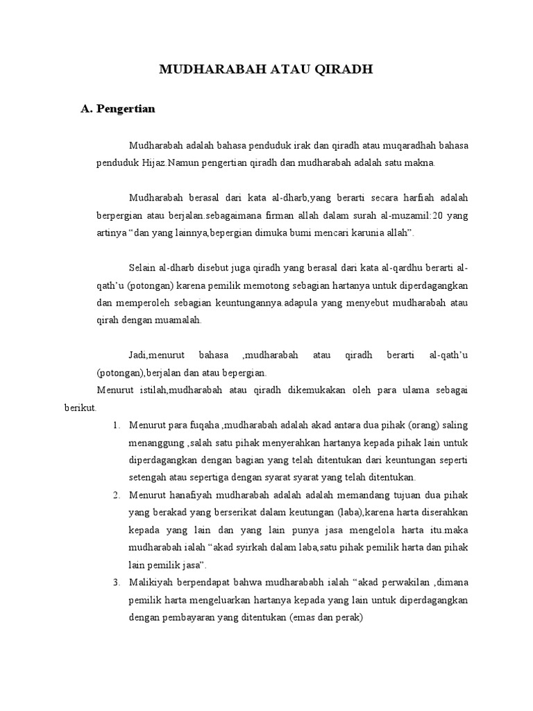 Doc Pengertian Qiradh Dan Syirkah Menurut Empat Madzhab Syahrial Afifudin Academia Edu from 0.academia-photos.com Qiradh adalah harta yang diberikan kepada orang lain dari mal mitsli untuk kemudian dibayar atau dikembalikan. Qiradh ialah kerja sama dalam bentuk pinjaman modal tanpa bunga dengan perjanjian bagi hasil. Potongan, pemilik memberikan potongan dari hartanya untuk diberikan kepada pengusaha agar mengusahakan harta tersebut, dan pengusaha akan memberikan. Melakukan mudharabah atau qiradh adalah boleh (mubah). Qiradh hukumnya mubah, bahkan dianjurkan dalam ajaran islam. Diantara akad tersebut adalah mudharabah, dan musyarakah. Nama qiradh paling cocok untuk nama depan. Hukum akad qiradh adalah boleh.